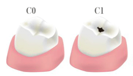 C1~C2のむし歯では、エナメル質に穴が開いたり、むし歯が象牙質の表層部に及んでいたりするので、 酸で侵された部分を削って修復材を詰めます。