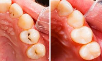 それを避けるために、あえてむし歯を少し残し、象牙質の増殖を促す水酸化カルシウムなどの薬を塗布して、 セメント剤などでふたをします。後日ふたを取り、象牙質が十分に増殖していたら、レジン修復を行います。