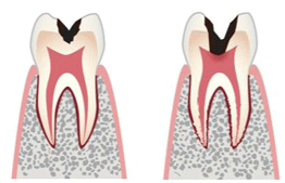 むし歯が象牙質のなかまで進んでいると、削る部分が大きく、深くなるので、レジン修復では対応できないことが多くなります。